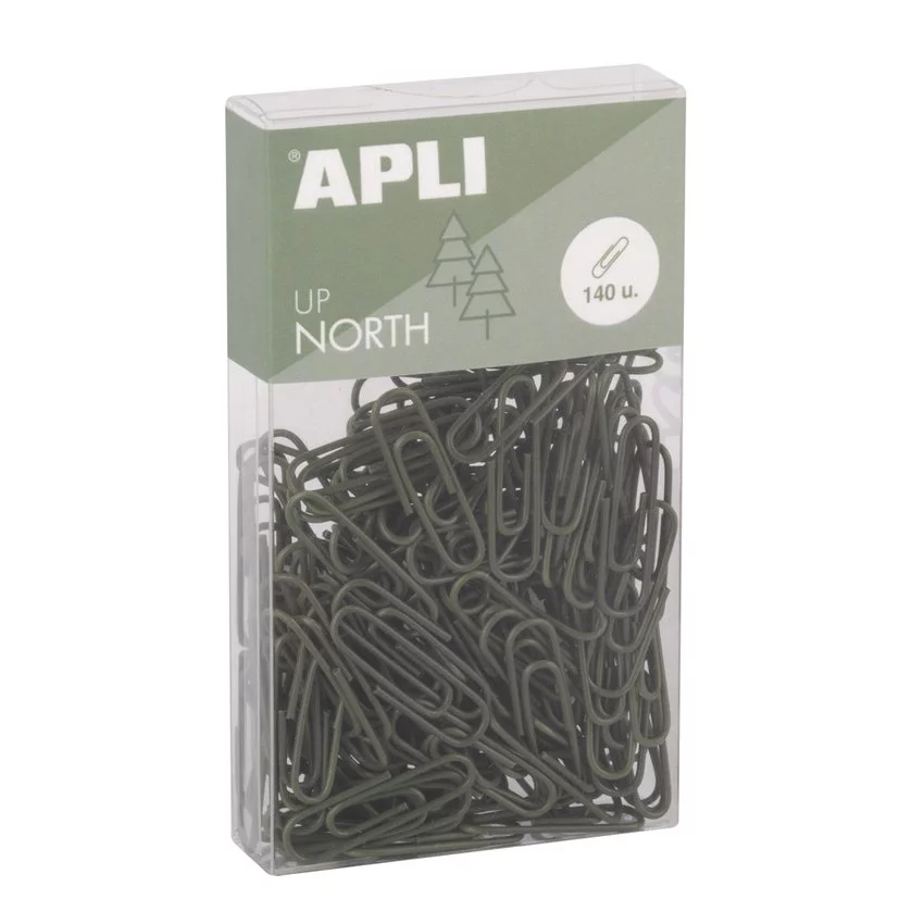 Spinacze okrągłe APLI Up North, 28mm, 140szt., pudełko z zawieszką, khaki — Metalowe spinacze w plastikowym pudełku z eurozawieszką idealne do dodania odrobiny koloru przy organizacji dokumentów