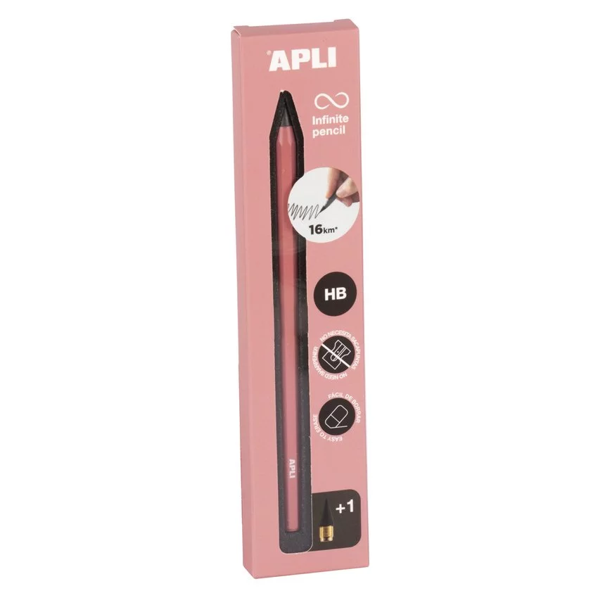 Ołówek wieczny APLI Infinite, HB, pudełko kart. z zawieszką, różowy — Innowacyjny ołówek o wyjątkowej trwałości niezwykła trwałość, miękki, łatwo ścieralny wkład i brak konieczności używania temperówki sprawiają, że używanie ołówka jest przyjemne i bardzo komfortowa umożliwia narysowanie linii o długości 16 kilometrów bez konieczności temperowania metalowa obudowa w zestawie znajduje się dodatkowy wkład oraz przezroczysta skuwka