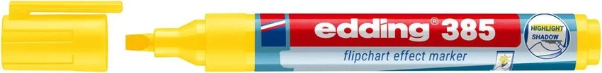 Marker do efektów na flipchartach e-385 EDDING, żółty — Marker do efektów na flipchartach do podkreślania i cieniowania lub tworzenia akcentów na wizualizacjach, nagłówkach i ważnych oświadczeniach elastyczna końcówka pędzelkowa o zmiennej grubości 1-5 mm tusz o neutralnym zapachu, dostępny w wielu jaskrawych kolorach, nie przebija na następne strony dzięki tuszowi „cap-off” można pozostawić skuwkę bez zatyczki przez kilka dni bez ryzyka wyschnięcia produkt można uzupełniać za pomocą tuszu edding FETK 25 zatyczka może być pozostawiona na końcu obudowy, przez co minimalizuje się ryzyko jej zgubienia praktyczny klips zapobiega toczeniu się po blacie i jest idealny do przypinania markera do ubrań i innych przedmiotów obudowa markera wykonana jest w 55% z materiałów pochodzących z recyklingu opakowanie wykonane z kartonu z certyfikatem FSC