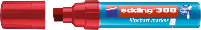 Marker do flipchartów e-388 EDDING, 4-12mm, czerwony — Marker do flipchartów z szeroką końcówką zaprojektowany do pisania i znakowania na papierze flipchartowym, prezentacyjnym / kartonie i innych rodzajach papieru ścięta końcówka o grubości 4-12mm tusz o neutralnym zapachu, nie przebija na następne strony dzięki technologii cap-off mogą być pozostawione bez zatyczki nawet na kilka tygodni bez ryzyka wyschnięcia (testy przeprowadzone zgodnie z normami ISO 554) zapasowe końcówki (wymienne końcówki do edding 388) są dostępne