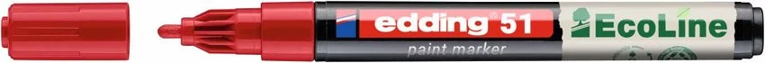 Marker olejowy na bazie wody e-51 EDDING EcoLine, 1-2mm, czerwony — Profesjonalny marker olejowy do wysoce kryjącego i trwałego znakowania i etykietowania na ciemnych, przezroczystych i gładkich materiałach przyjazny dla środowiska, bezwonny tusz na bazie wody z niską zawartością lotnych związków organicznych (LZO) obudowa markera wykonana w co najmniej 75% z materiałów pochodzących z recyklingu poużytkowego tusz markera jest odporny na działanie światła, szybko wysycha i jest wodoodporny pierwszy marker olejowy z możliwością ponownego napełniania marki Edding! Dostępne są odpowiednie zapasowe końcówki wyprodukowany w Niemczech