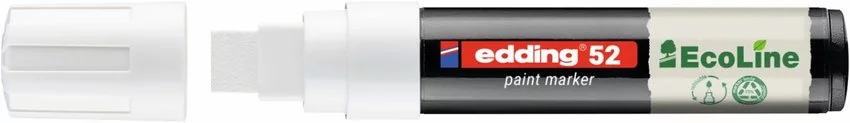 Marker olejowy na bazie wody e-52 EDDING EcoLine, 4-15mm, biały — Profesjonalny marker olejowy do wysoce kryjącego i trwałego znakowania i etykietowania na ciemnych, przezroczystych i gładkich materiałach przyjazny dla środowiska, bezwonny tusz na bazie wody z niską zawartością lotnych związków organicznych (LZO) obudowa markera wykonana w co najmniej 75% z materiałów pochodzących z recyklingu poużytkowego tusz markera jest odporny na działanie światła, szybko wysycha i jest wodoodporny pierwszy marker olejowy z możliwością ponownego napełniania marki Edding! Dostępne są odpowiednie zapasowe końcówki wyprodukowany w Niemczech