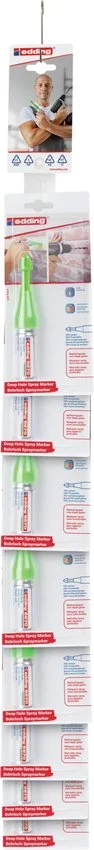 Marker w sprayu e-8870 EDDING, do głębokich otworów, 16 szt., clipstrip, zielony neon — Kreda w sprayu z opatentowanym mechanizmem pompki do nietrwałego znakowania w trudno dostępnych miejscach, na prawie wszystkich materiałach indywidualnie ukształtowana dysza spreju do kredy umożliwia znakowanie przez otwory o głębokości do 50 mm i średnicy 3-13 mm może być używany pod każdym kątem i z każdej wysokości, nawet nad głową nietrwała kreda jest łatwa do wytarcia z zamkniętych powierzchni w celu dokonania szybkich poprawek 16 szt. W j. S.