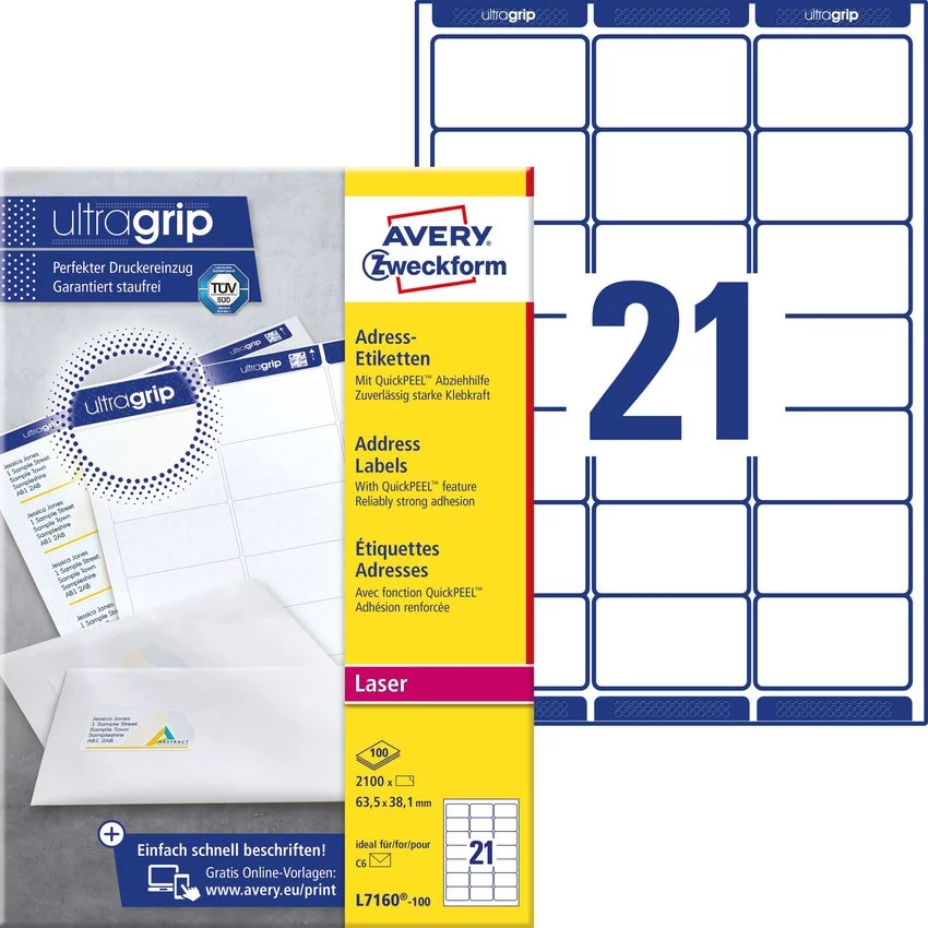 Samoprzylepne etykiety adresowe Avery 63.5x38.1 21/A4 A'100 białe No.L7160-100