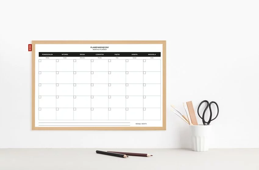 Tablica Planer Memobe, Miesięczny, Nadruk W Kolorze Czarnym, Rama Drewniana, 60X40 Cm