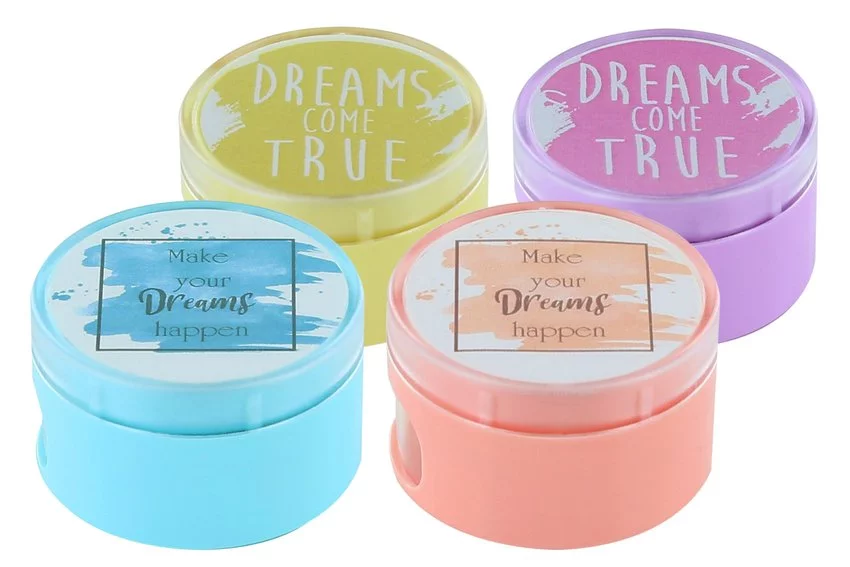 Temperówka metalowa KUM z serii Quotes Pastell z pojemnikiem na ostrużyny. Podwójna, wykonana ze stopu magnezu, przeznaczona do sześciokątnych lub okrągłych ołówków i kredek o średnicy 8 mm i 11 mm. Atrakcyjna plastikowa obudowa z cytatami o marzeniach w modnych kolorach pastelowych. Zamykany pojemnik z dodatkowym zabezpieczeniem otworów temperówki zapobiega przed wysypywaniem się ostrużyn. Wysokiej jakości ostrze ze stali wysokowęglowej solidnie połączone z obudową zapewnia precyzję temperowania i idealnie centralne położenie ołówka lub kredki. Technologia Dynamic Torsion Action dzięki odpowiedniemu napięciu i stabilności ostrza, poprzez jego delikatne wygięcie i mocowanie za pomocą wkrętu, minimalizuje ryzyko złamania grafitu. Wyprodukowana w Niemczech. Dostarczana w opakowaniu 12 szt.