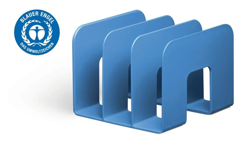 Stojak na katalogi z trzema przedziałami o szerokości 65 mm do większej ilości czasopism lub korespondencji seria ECO wykonany z tworzyw z recyklingu w kolorze niebieskim