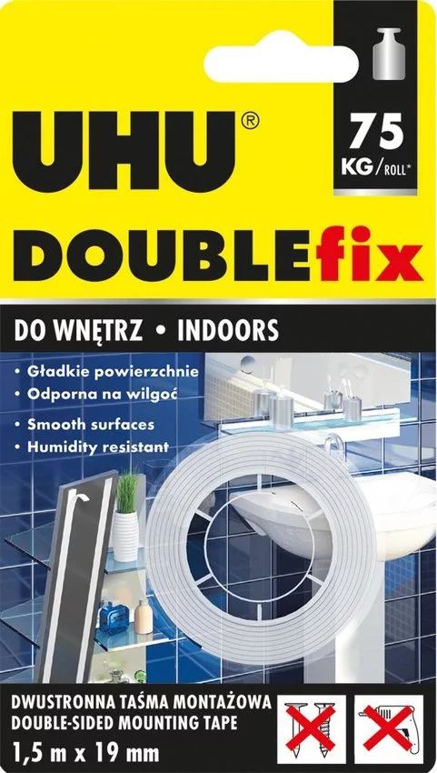 - Wszechstronne zastosowanie: UHU Doublefix to taśma o szerokim zakresie użycia. Doskonale sprawdza się w montażu luster, uchwytów, znaków, haczyków, elementów regałów, kanałów kablowych, profili dekoracyjnych, a także innych przedmiotów dekoracyjnych i funkcjonalnych.