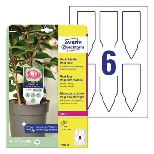 Białe, dwustronne, foliowe tabliczki do oznaczania roślin Avery Zweckform T3006-10 do zadruku, w formacie 128 x 47 mm. Tabliczki są wodoodporne i idealne np. do oznaczania i opisywania roślin w szkółkach oraz centrach ogrodniczych, do oznaczania cen i opisywania produktów w handlu detalicznym oraz hurtowym, w rolnictwie, a także do użytku prywatnego w ogrodnictwie i gospodarstwie domowym. 60 białych, foliowych tabliczek do oznaczania roślin na 10 arkuszach, do samodzielnego zadrukowania.