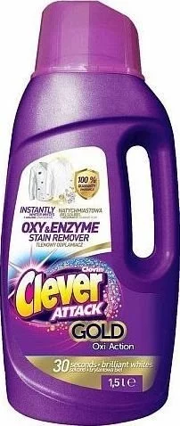 Clever Attack Gold to profesjonalny tlenowy odplamiacz w płynie o pojemności 1,5 litra, inspirowany produktami z linii Clovin Professional. Dzięki nowoczesnej formule usuwa nawet najbardziej uporczywe plamy już po 30 sekundach, nie niszcząc tkanin i nie powodując blaknięcia kolorów.