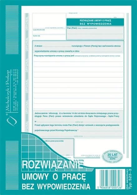 Rozwiązanie Umowy o Pracę Bez Wypowiedzenia A5 Oryg.+1k 523-3 /MiP