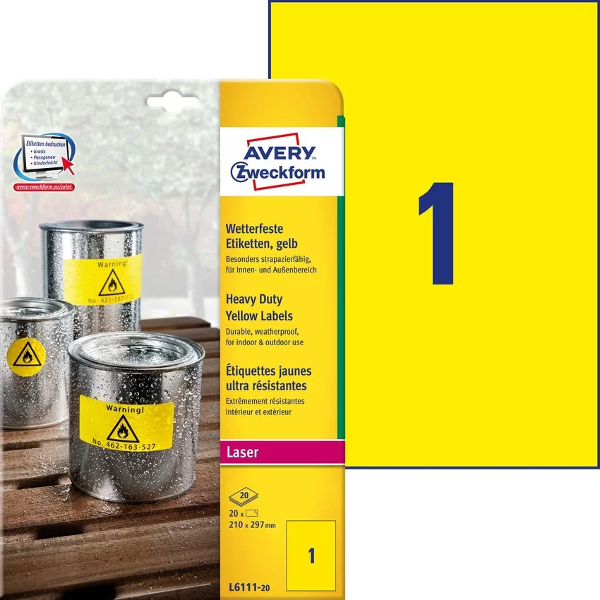 - Etykiety samoprzylepne Avery Zweckform L6111-20 idealnie nadają się do oznaczania przedmiotów pozostających pod wypływem czynników zewnętrznych. Etykiety w kolorze żółtym - świetnie sprawdzą się przy tworzeniu znaków ostrzegawczych.
