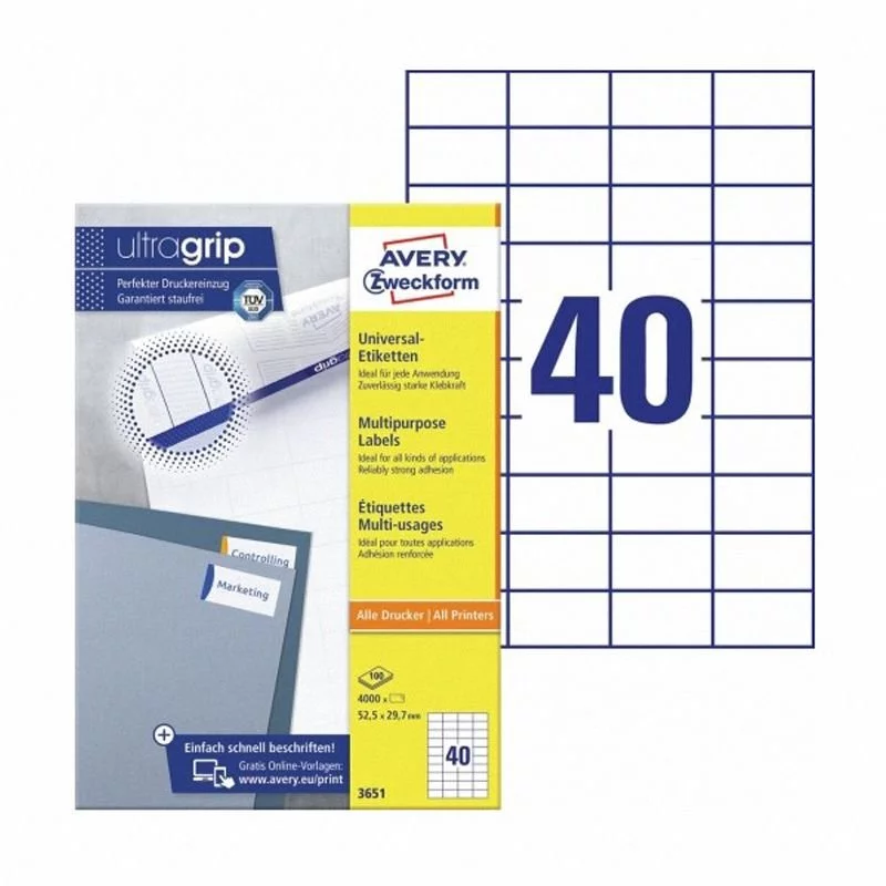 - Etykiety samoprzylepne, uniwersalne Avery Zweckform 3651 w kolorze białym. Etykiety do zadruku w drukarkach atramentowych, laserowych oraz kopiarkach.