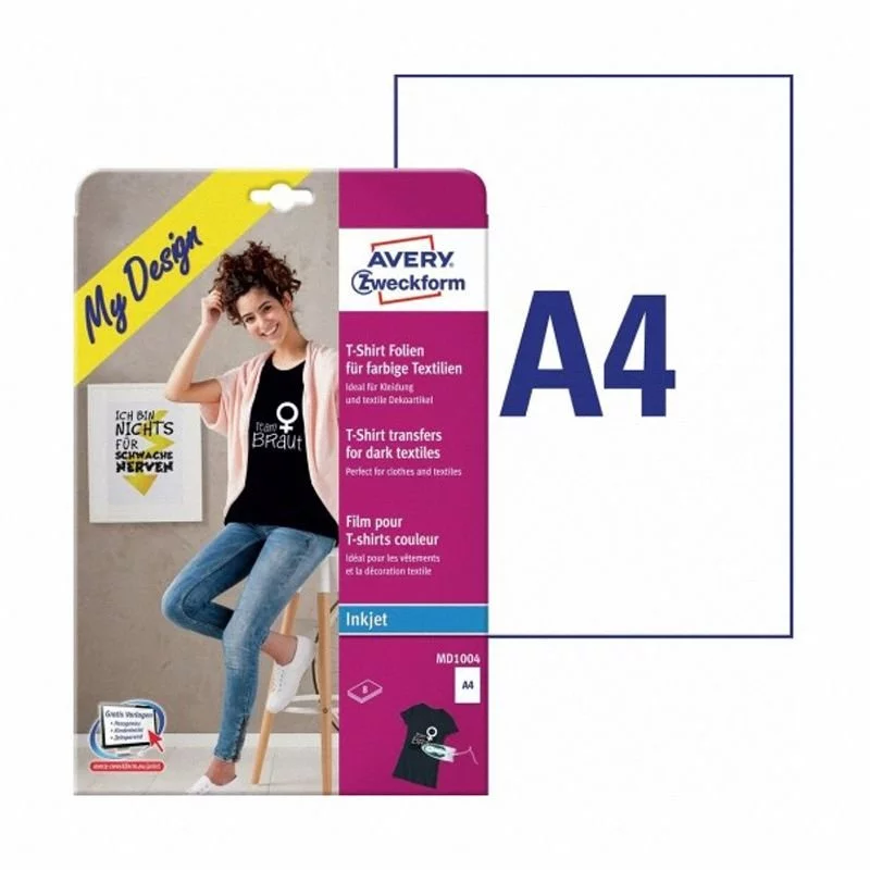 - Folie transferowe Avery Zweckform MD1004 do kolorowych tkanin. Do zadruku na każdej drukarce atramentowej. Łatwa i szybka do naprasowania na materiałach bawełnianych.