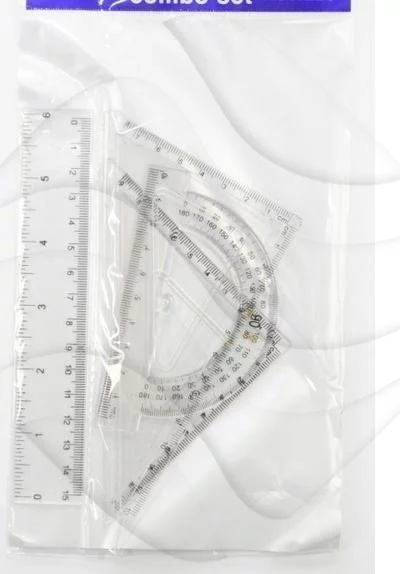 Zestaw zawiera: linijka, 2x ekierka, kątomierz.