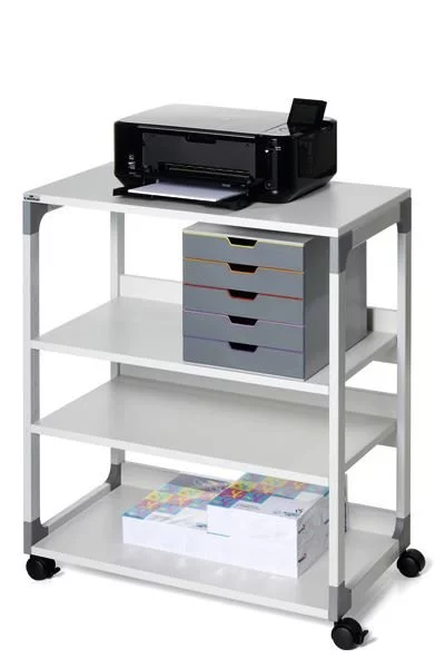 - Wielofunkcyjny stolik biurowy na kółkach z czterema półkami. Wykonany ze stali pokrytej żywicą epoksydową. Z narożnikami z tworzywa sztucznego wzmocnionego włóknem szklanym oraz pokrytymi melaniną półkami o grubości 19 mm