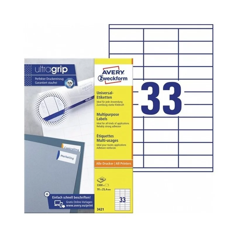 - Etykiety samoprzylepne, uniwersalne Avery Zweckform QuickPeel 3421 w kolorze białym. Łatwe w przyklejaniu i odklejaniu. Gwarancja trwałego, odpornego na ścieranie druku. Do zastosowania w drukarkach laserowych oraz kopiarkach.