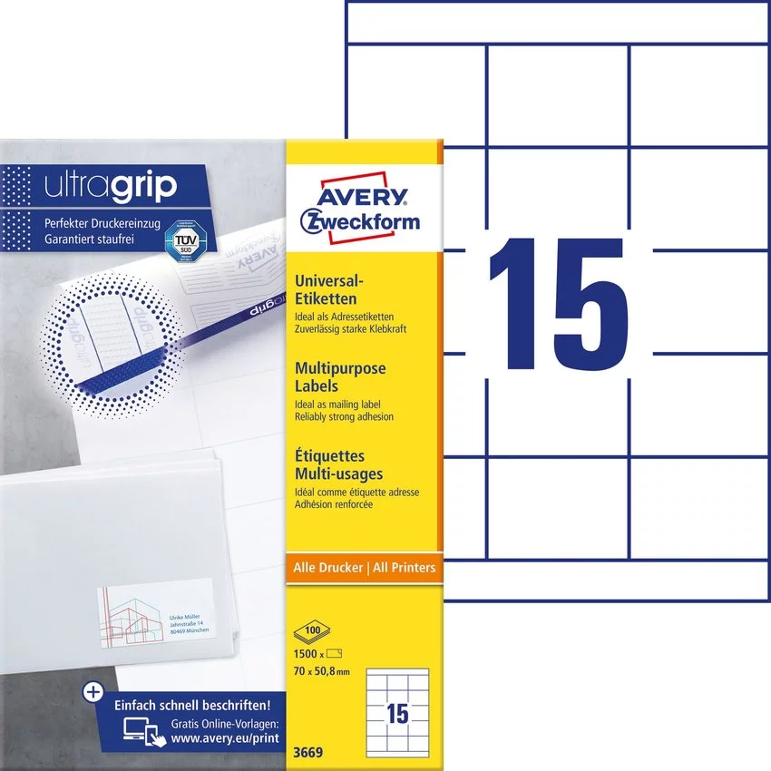 - Etykiety samoprzylepne, uniwersalne Avery Zweckform 3669, kolor biały. Do użytku w drukarkach laserowych oraz kopiarkach. Zapewniają ostry wydruk bez wycieku kleju poza krawędź etykiety.