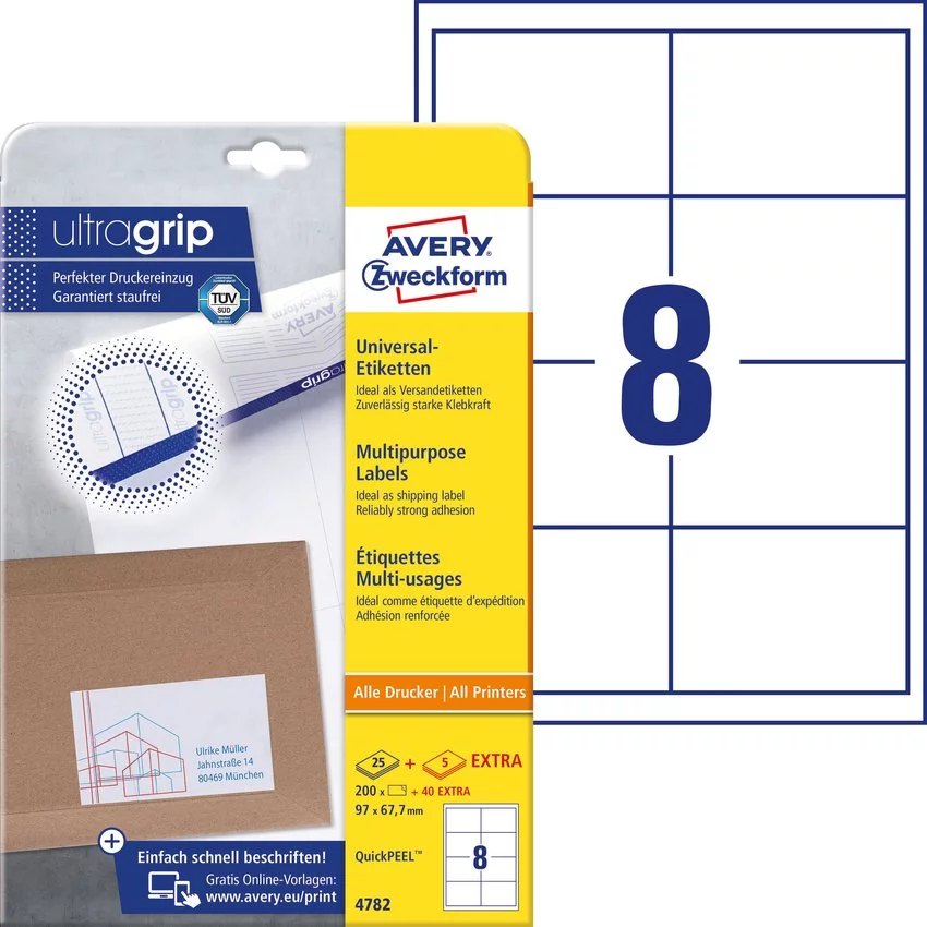 - Etykiety samoprzylepne, uniwersalne Avery Zweckform 4782, kolor biały. Do użytku w drukarkach laserowych oraz kopiarkach. Zapewniają ostry wydruk bez wycieku kleju poza krawędź etykiety.
