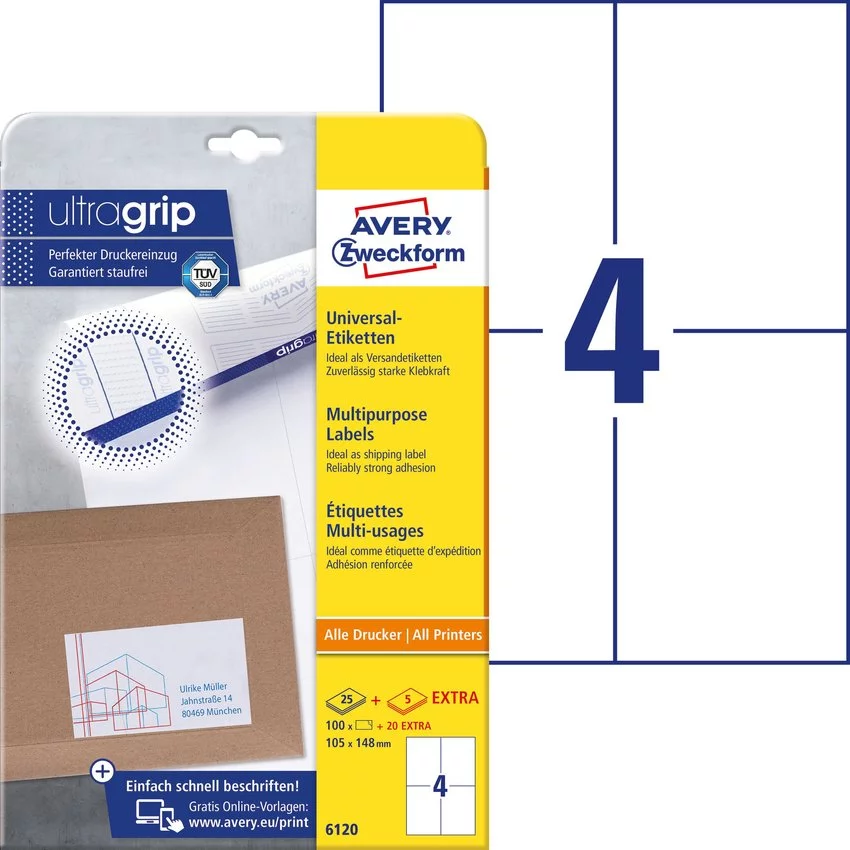 Etykiety Samoprzylepne Avery 105x148 4/A4 A'25 Białe No.6120