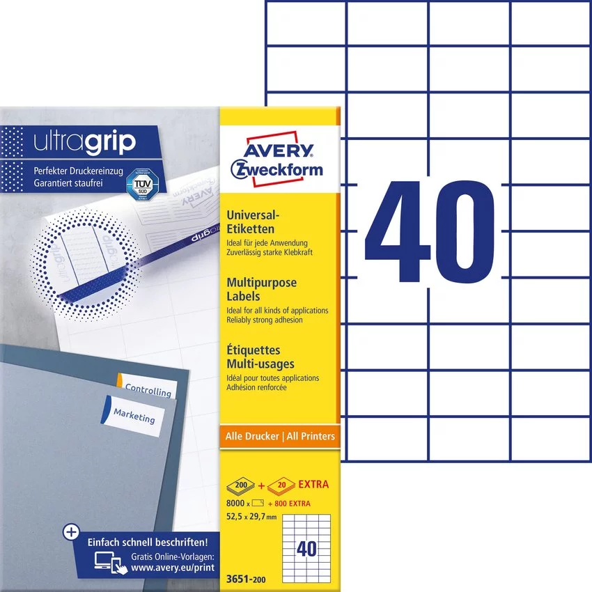 Etykiety Samoprzylepne Avery 52.5x29.7 40/A4 A'200 Białe No.3651-200