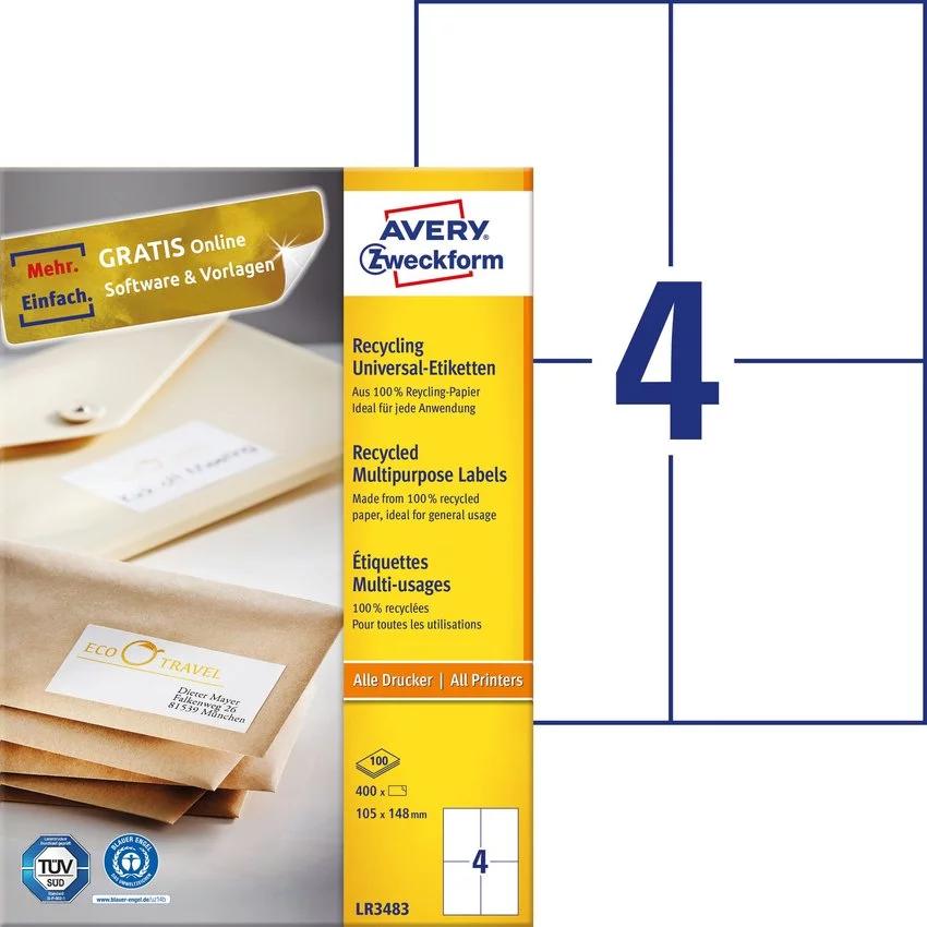 Etykiety Samoprzylepne Recyklingowane Avery 105x148 4/A4 A'100 Białe No.LR3483
