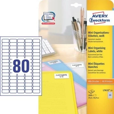 - Mini etykiety samoprzylepne, adresowe Avery Zweckform L7632-25 w kolorze białym; Idealne do oznaczania korespondencji zwrotnej oraz teczek, skoroszytów czy pudełek. Do drukarek laserowych oraz kopiarek.