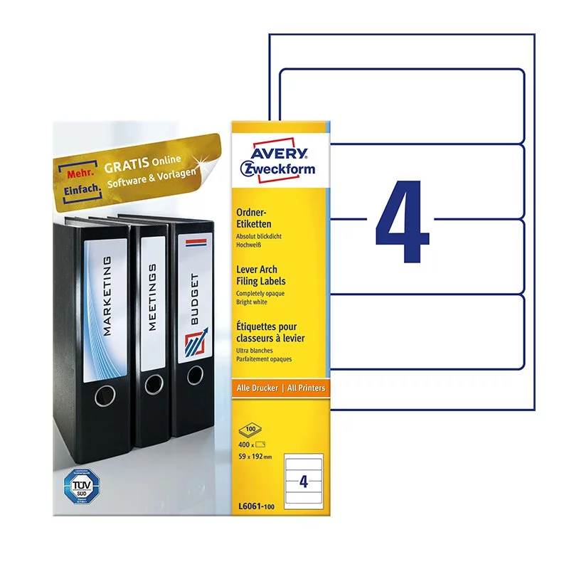 - Etykiety samoprzylepne do segregatora Avery Zweckform L6061-100, kolor biały. Mocno kryjące. Idealne do oznaczania zawartości segregatorów. Do drukarek atramentowych, laserowych oraz kopiarek.