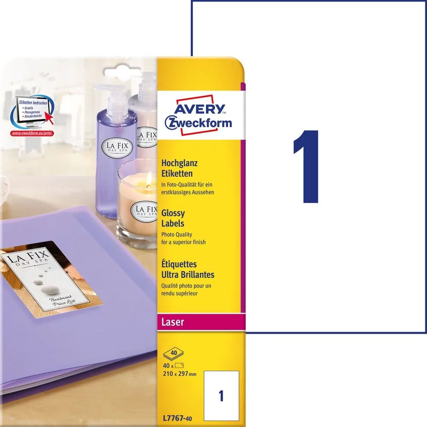 - Etykiety samoprzylepne, błyszczące Avery Zweckform L7767-40, białe. Posiadają eleganckie, błyszczące wykończenie. Świetnie sprawdzą się jako etykiety do oznaczania produktów przeznaczonych do sprzedaży.