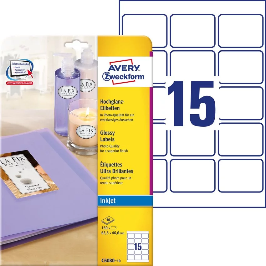 Etykiety Błyszczące Avery 63.5x46.6 15/A4 A'10 Białe No.C6080-10