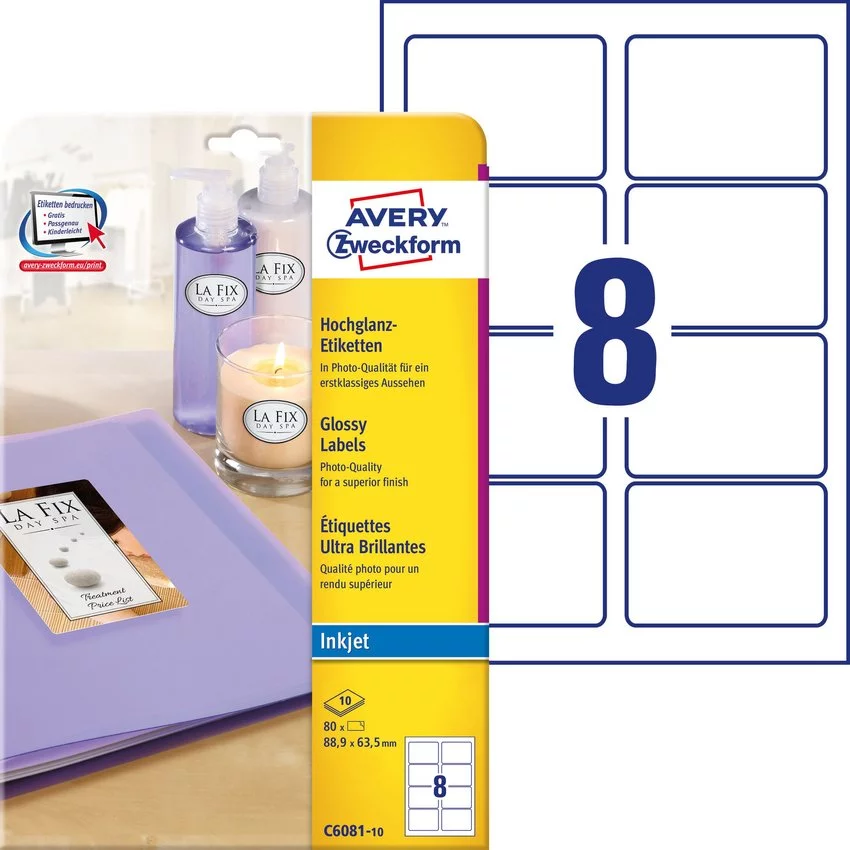 - Etykiety samoprzylepne, błyszczące Avery Zweckform C6081-10, białe. Posiadają eleganckie, błyszczące wykończenie. Świetnie sprawdzą się jako etykiety do oznaczania produktów przeznaczonych do sprzedaży.