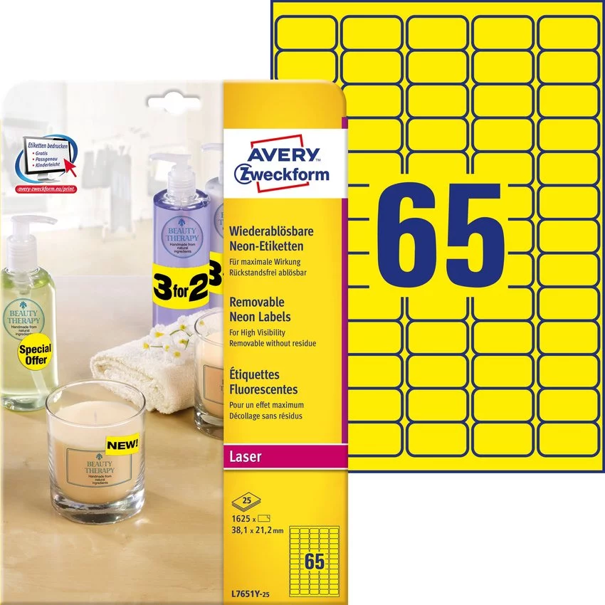 - Etykiety samoprzylepne Avery Zweckform L7651Y-25 kolor neonowy żółty, usuwalne. Łatwe w usunięciu, nie pozostawiają śladów kleju. Do drukarek atramentowych, laserowych oraz kopiarek. Posiadają certyfikat ekologiczny FSC oraz certyfikat jakości TÜV.