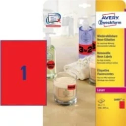 - Etykiety Avery Zweckform L6005-25 w kolorze neonowym czerwonym, usuwalne. Łatwe w usunięciu, nie pozostawiają śladów kleju. Do drukarek atramentowych, laserowych oraz kopiarek. Posiadają certyfikat ekologiczny FSC oraz certyfikat jakości TÜV.