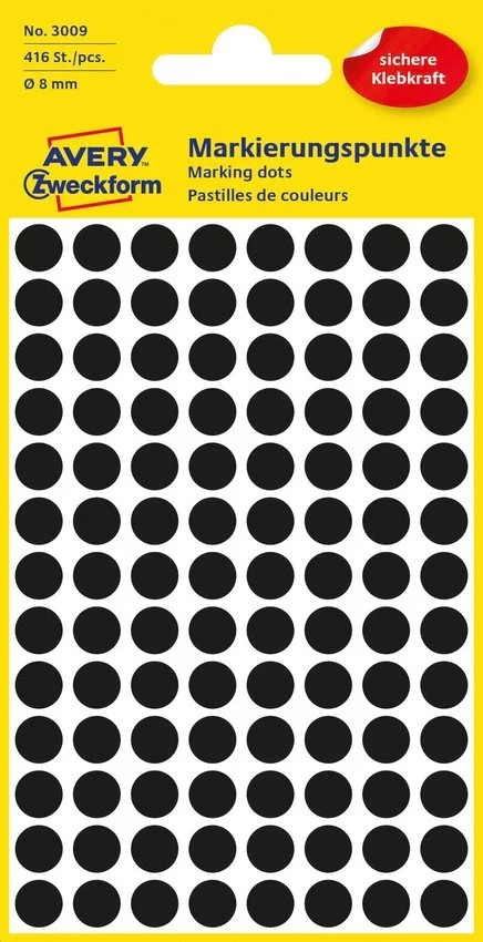 - Kółka Avery Zweckform 3009, kolor czarny. Świetnie sprawdzą się do zaznaczania dat urlopów, spotkań czy miejsc na mapie. Szeroki asortyment rozmiarów i kolorów. Idealne do kolorystycznego oznaczania dokumentów.
