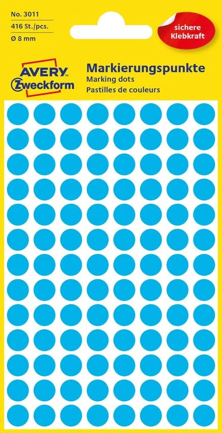 - Kółka Avery Zweckform 3011, kolor niebieski. Świetnie sprawdzą się do zaznaczania dat urlopów, spotkań czy miejsc na mapie. Szeroki asortyment rozmiarów i kolorów. Idealne do kolorystycznego oznaczania dokumentów.