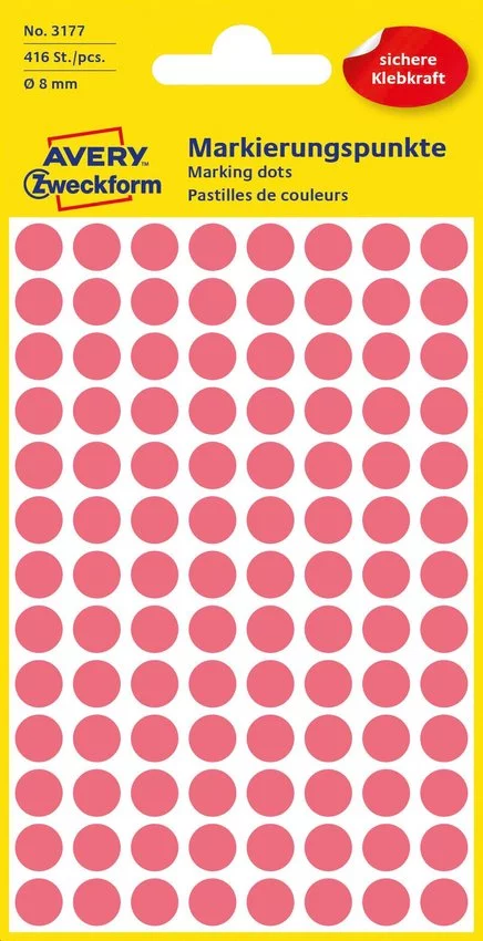 - Kółka odblaskowe Avery Zweckform 3177, kolor czerwony. Świetnie sprawdzą się do zaznaczania dat urlopów, spotkań czy miejsc na mapie. Szeroki asortyment rozmiarów i kolorów. Idealne do kolorystycznego oznaczania dokumentów.