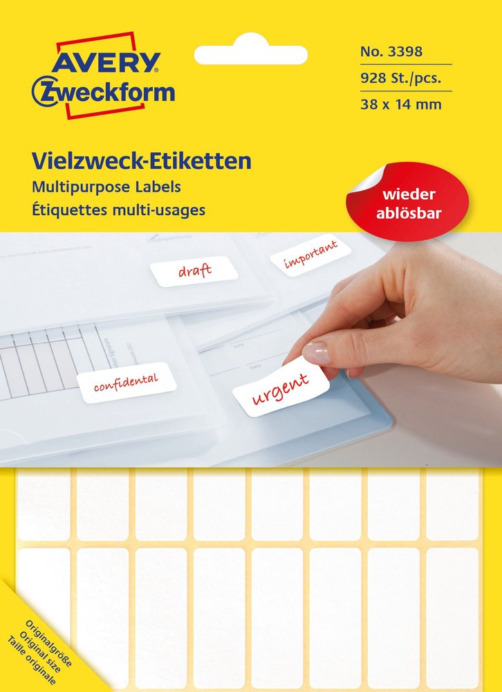 Jak oznaczyć to wszystko tak, aby Twoi współpracownicy wiedzieli, gdzie wszystko się znajduje? Usuwalne etykiety uniwersalne Avery Zweckform w jednej chwili zapewniają porządek i przejrzystość i mogą być opisane odręcznie. Jeżeli ich znaczenie nie jest już aktualne wymień je na nowe. Nasze etykiety usuwalne pewnie przylegają, ale można je łatwo usunąć bez pozostawienia śladu. Skorzystaj z tej prostej i oszczędnej metody aby lepiej zorganizować swoje biuro.Usuwalne etykiety do opisu ręcznego