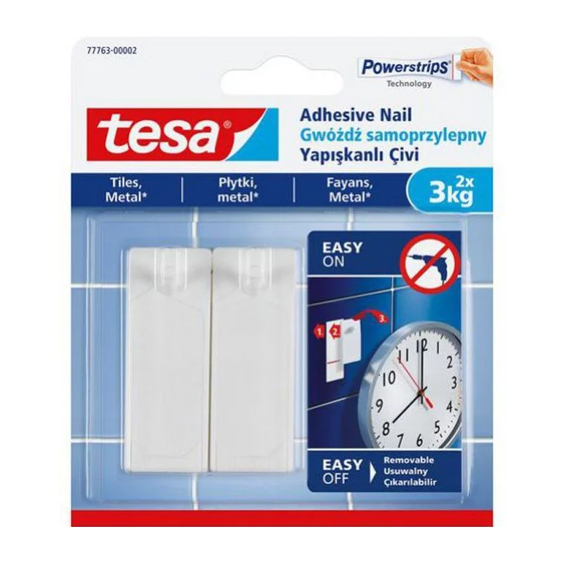 Zaprojektowany z myślą o cięższych dekoracjach i akcesoriach kuchennych i łazienkowych skuteczny gwóźdź samoprzylepny tesa® poradzi sobie z ciężarem od 3-6 kg przy użyciu dwóch gwoździ jednocześnie. Cechą charakterystyczną jest bardzo łatwy montaż i demontaż przy użyciu samoprzylepnych plastrów tesa. Dzięki technologi Powerstrips unika się wiercenia w płytkach przez co nie naraża się ich na uszkodzenie. Zaletą jest niewątpliwie możliwość demontażu i ponownego użycia.