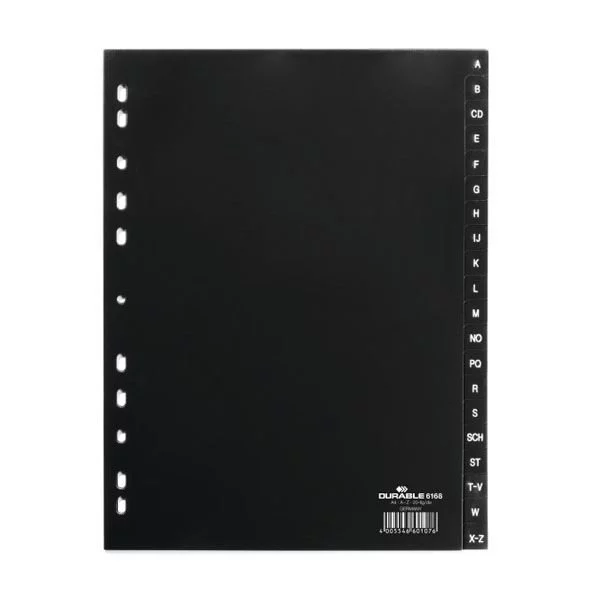 Prezentujemy przekładki znanej niemieckiej marki Durable. Są bardzo wytrzymałe (wykonano je z polipropylenu) i zawierają nadrukowane, alfabetyczne indeksy, które z pewnością ułatwią Ci wyszukiwanie odpowiednich dokumentów. Dodatkowo, posiadają uniwersalną perforację, więc idealnie nadają się do wszystkich standardowych segregatorów.