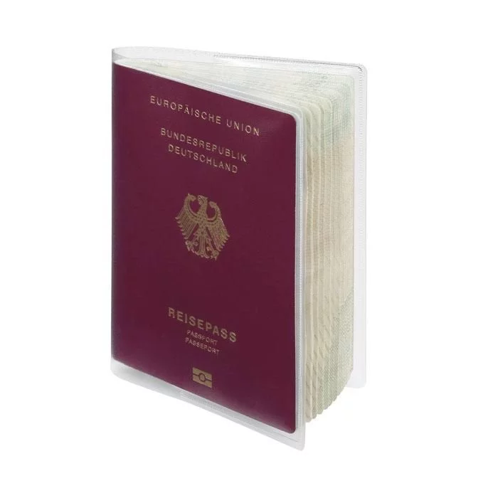 Etui ochronne na paszport wykonane z przeźroczystej folii. Wymiary: 189 x 129 mm (szer. x wys.)