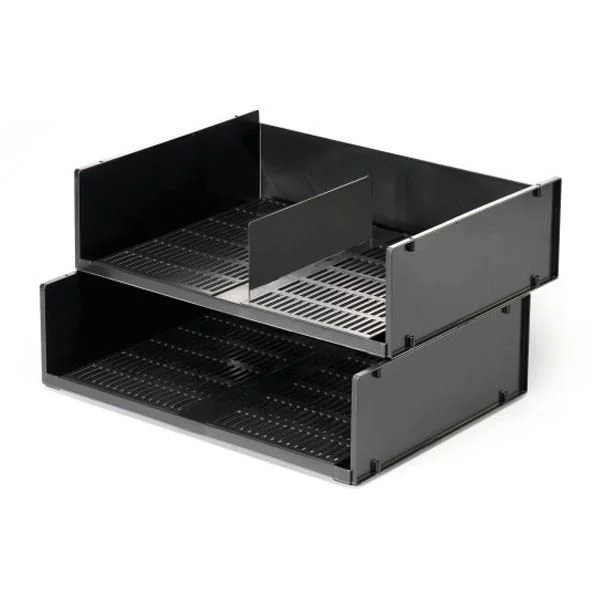 Chcesz uporządkować dokumenty, nad którymi pracujesz? Możesz to zrobić za pomocą specjalnych tacek na dokumenty, marki Durable. Takie półki, można ustawiać jedna na drugą, przy wykorzystaniu dodatkowych, srebrnych nóżek - dzięki temu ułatwisz sobie dostęp do dokumentów.