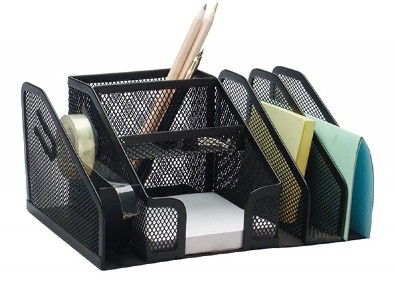 Przybornik na biurko wykonany z metalowej siateczki powlekanej lakierem. Posiada 4 przegrody na korespondencje, 1 komora na artykuły piśmienne, 1 komora na drobne akcesoria biurowe (gumki, spinacze, itp.), 1 komora na karteczki, 1 przegroda z dyspenserem do taśmy.Posiada gumowe nóżki. Kolor czarny.