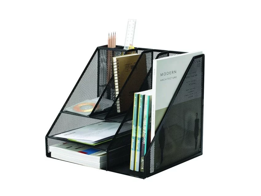 Organizer z przybornikiem wykonany z metalowej siateczki powlekanej lakierem.Posiada 8 przegródek : 2 pionowe przegródki na artykuły piszące, 2 pionowe przegródki na korespondencje, 2 poziome przegródki na dokumenty A4, 1 pionowa przegródka o szerokość 11,5 cm na katalogi i segregator, 1 przegródka na karteczki lub inne artykuły biurowe np. zszywacz, dziurkacz.Wyposażony jest w 4 antypoślizgowe nóżki.Kolor czarny.