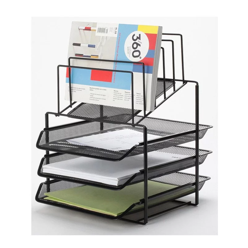 Zestaw trzech wysuwanych szuflad wykonanych z metalowej siateczki powlekanej lakierem. zestaw wyposażony dodatkowo w miejsce na katalogi, ulotki lub korespondencję (5 przegródek).