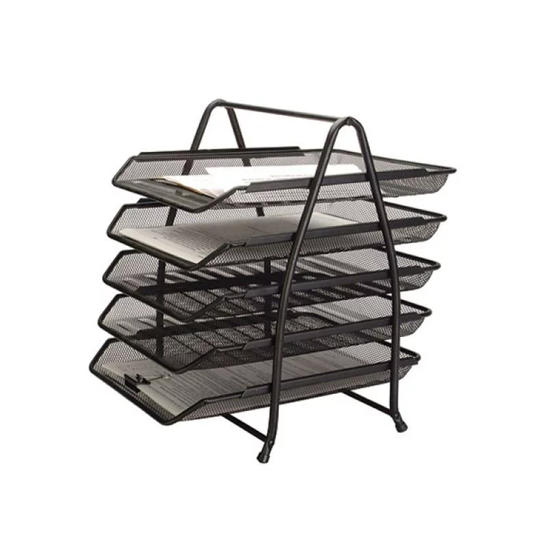 Zestaw 5 szuflad na dokumenty lub czasopisma wykonany z metalowej siateczki powlekanej lakierem.