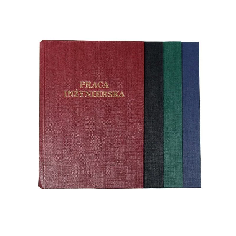 Twarda oprawa systemu C-BIND firmy OPUS składająca się z okładki przedniej oraz tylnej wykonanej z kartonu powlekanego okleiną Classic o fakturze tkaniny wykonanej z lnu. Dodatkowo przednia okładka posiada wyzłocenie “Praca Inżynierska”. Okładki w formacie A4+ pionowo połączone są metalowym kanałem.