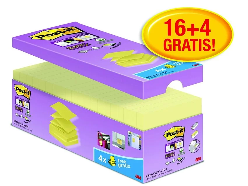 Bloczek Samoprzylepny Post-It Super Sticky Z-Notes (R330-Sscy-Vp20) 76X76Mm 16X90 Kart. Zółty 4 Bloczki Gratis