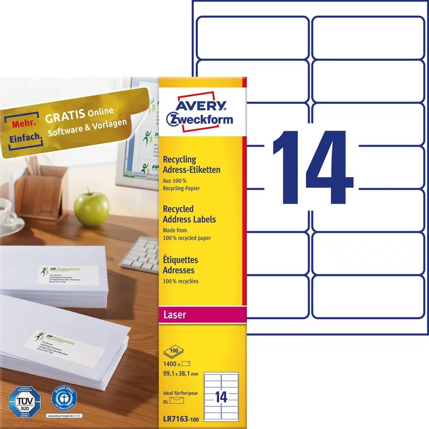 Naturalne białe etykiety adresowe LR7163-100 do drukarek laserowych w formacie 99,1x38,1 mm od AVERY ZWECKFORM są idealne do długich kopert DIN. Naklejki są wykonane w 100% z bezchlorowego papieru bielonego i posiadają certyfikat ekologiczny „Blue Angel”. Podczas produkcji nie występują emisje, a odpady produkcyjne są całkowicie poddawane recyklingowi. Możesz liczyć na całkowicie wolną od zacięć przepustkę drukarki bez osadzania się kleju w drukarce. Karta dostępu do drukarek laserowych przetestowana i potwierdzona przez TÜV SÜD. Szybkie i łatwe projektowanie i drukowanie etykiet adresowych dzięki bezpłatnym szablonom etykiet i rozwiązaniom programowym Avery Zweckform dostępnym na stronie www.avery-zweckform. eu / print lub szablony zintegrowane z pakietem Microsoft® Office. Łatwo obieraj i przyklejaj dzięki unikatowej pomocy Peeling-QuickPEEL ™. Nadaje się do wszystkich popularnych drukarek laserowych.