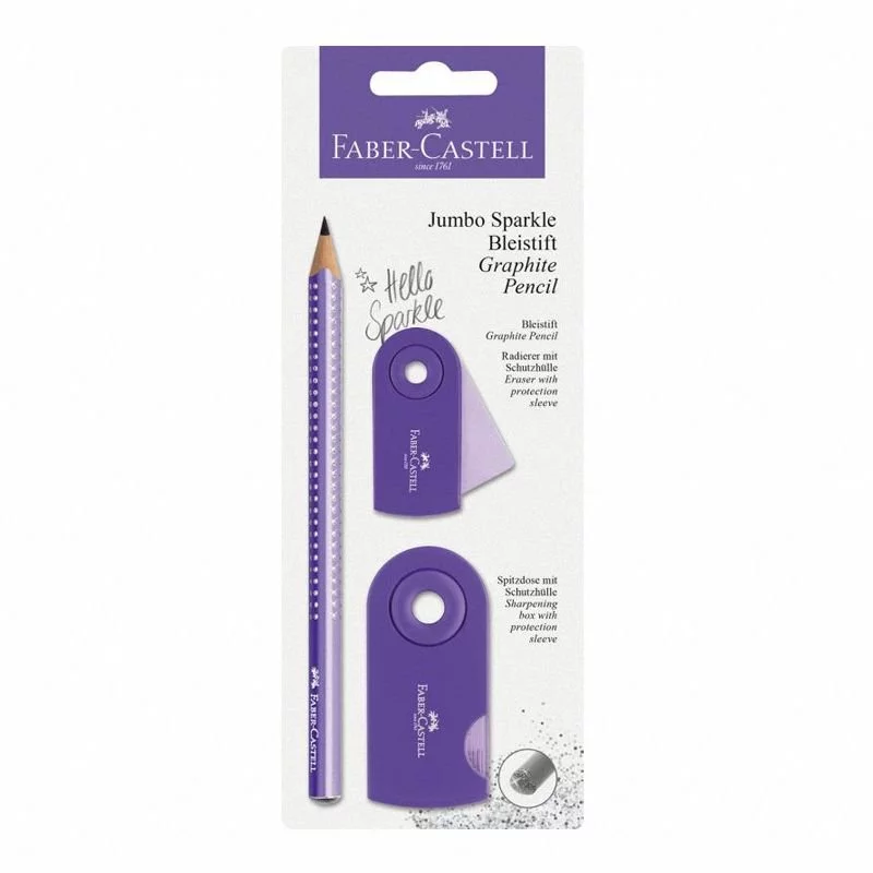 Zestaw Jumbo Sparkle Pearly&Sleeve (Ołówek+Temperówka+Gumka) Fioletowy Blister Faber-Castell