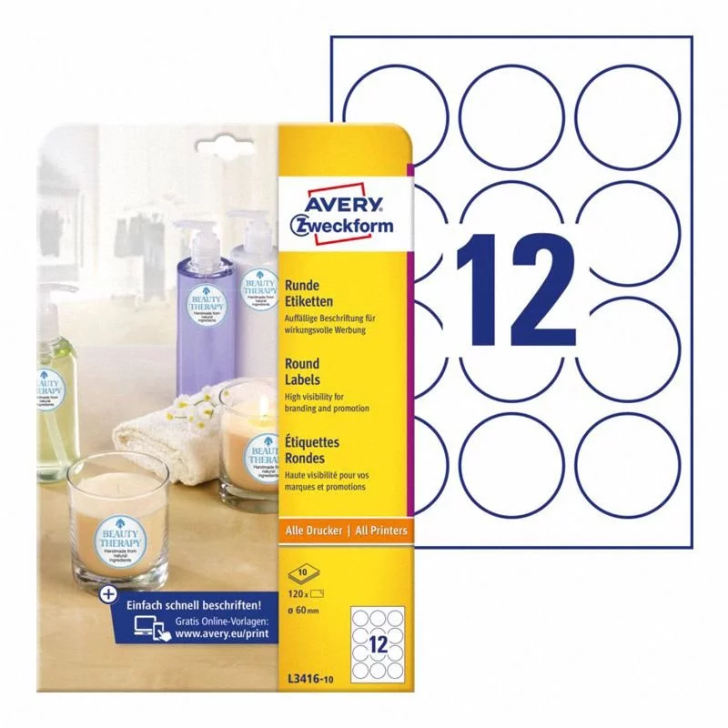 Etykiety Samop. Avery Okrągłe śr. 60mm 12/A4 Białe No.L3416-10